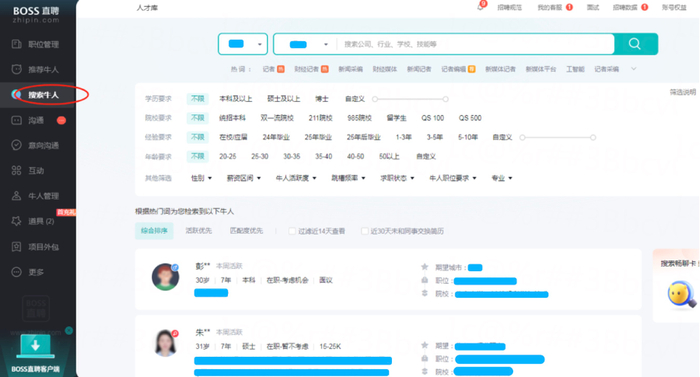 (上:BOSS直聘的搜索牛人库;下:猎聘的搜索人才库;需付费才能看到详细简历信息)