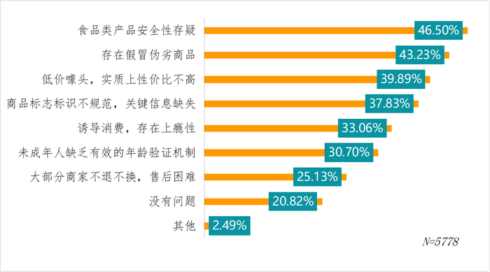 在了解对对碰直播带货的受访者中,46.5%的人对食品类产品安全性存疑;43.23%的人认为存在假冒伪劣商品;39.89%的人认为低价只是噱头,实质上性价比不高;37.83%的人认为商品标志标识不规范,关键信息缺失;33.06%的人认为诱导消费,存在上瘾性;30.7%的人认为对未成年人保护不足,缺乏有效的年龄验证机制;25.13的人%认为大部分商家不退不换,售后困难。仅有20.82%的人认为不存在问题。