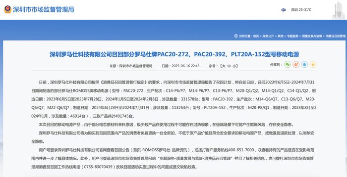深圳市市场监督管理局网站6月16日消息,日前,深圳罗马仕科技有限公司按照《消费品召回管理暂行规定》的要求,向深圳市市场监督管理局报告了召回计划,召回的三款产品共计491745台。将自16日起,召回2023年6月5日至2024年7月31日期间制造的部分罗马仕ROMOSS牌移动电源。