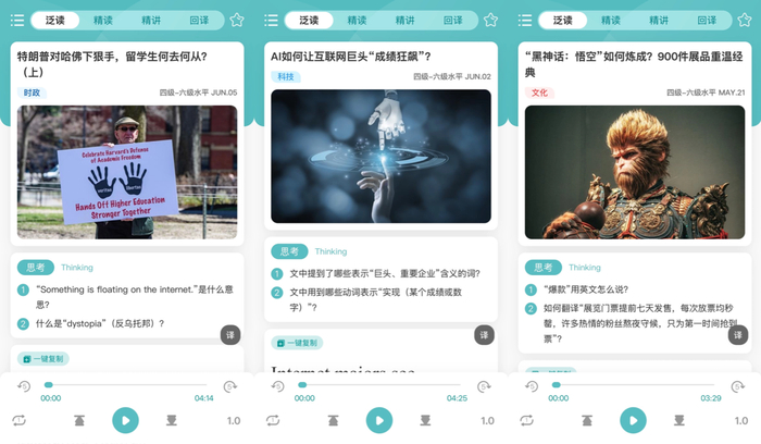 特别是学习过程中的一些功能,能帮大家将时间节省到极致:一键复制全文、点击查词、音频倍速切换、一键翻译、单词本、记笔记、搜索文章......实现便捷阅读,高效学习。
