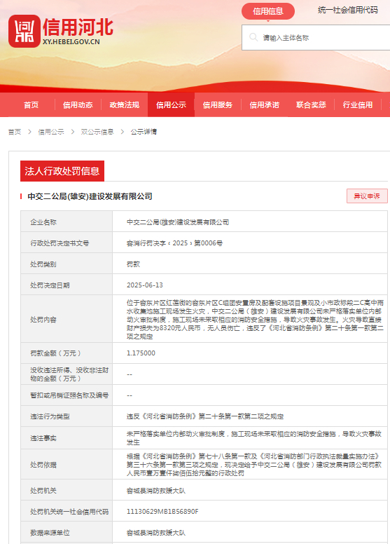 齐鲁晚报·齐鲁壹点记者于信用河北官网双公示信息栏了解到,6月13日,中交二公局(雄安)建设发展有限公司(下称“中交二公局雄安建发公司”)因“未严格落实单位内部动火审批制度,施工现场未采取相应的消防安全措施,导致火灾事故发生”的违法事实,上榜处罚信息公示名单。