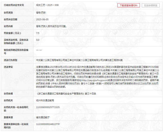 绍交工罚﹝2025﹞008号显示,其主要违法事实为:2025年4月22日11时16分,绍兴市交通运输局行政执法人员在104国道新昌荘前至关岭段改建工程第EPC01标段检查时发现中交二公局存在交通运输行政违法行为,经调查,施工单位中交二公局涉嫌伪造工程资料。绍兴市交通运输局依据《浙江省交通建设工程质量和安全生产管理条例》第三十四条的规定,对其罚款人民币7.5万元并警告。