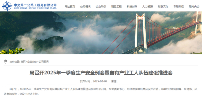 中交二公局官网“公司要闻”栏显示,3月7日,中交二公局召开2025年一季度生产安全例会暨自有产业工人队伍建设推进会。其党委副书记、总经理李灏在会上表示,要深刻认识当前安全生产形势,紧绷安全之弦,抓好复工达产安全生产、全员安全生产责任落实、重大风险和关键环节,做深做实安全督导检查。