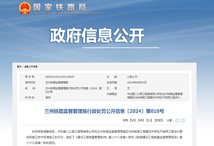 此外,据兰州铁路监督管理局行政处罚公开信息〔2024〕第010号,中交二公局在兰州铁路监督管理局辖区内的铁路工程建设中还存在不按照工程设计图纸和施工技术标准施工的行为,违反了《建设工程质量管理条例》第二十八条第一款和《铁路建设工程质量监督管理规定》第二十九条第一款的规定,被处罚款316107.8元。