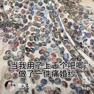 据原天夕子分享的视频,这件婚纱的创意源自“痛包”“痛车”,从展会前5天开始制作,直到参展当日凌晨才最终完成。除了日常的积攒,她还临时购买了一些吧唧,另有一部分来自朋友的赞助,最终凑成了这件创意“痛婚纱”。在上千个吧唧的“加持”下,婚纱重达80斤,这使得她最终不得不坐在手推车上出场。