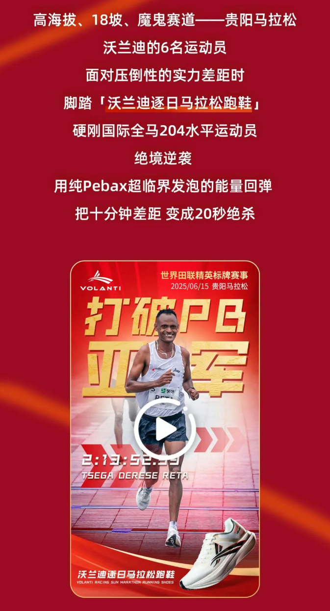 如果说场地赛是速度的较量,那么贵阳马拉松则是一场综合实力与意志的严酷考验。作为世界田联认证的精英标牌赛事,贵阳马拉松以其“高海拔、18坡”的“魔鬼赛道”特性更是化作马拉松的一座险峻高峰,对参赛者和装备都是极限挑战。面对拥有国际顶尖水平(全马204级别)对手的巨大压力,沃兰迪麾下的6名运动员,脚穿 沃兰迪逐日马拉松跑鞋 ,上演了一场荡气回肠的绝地反击。