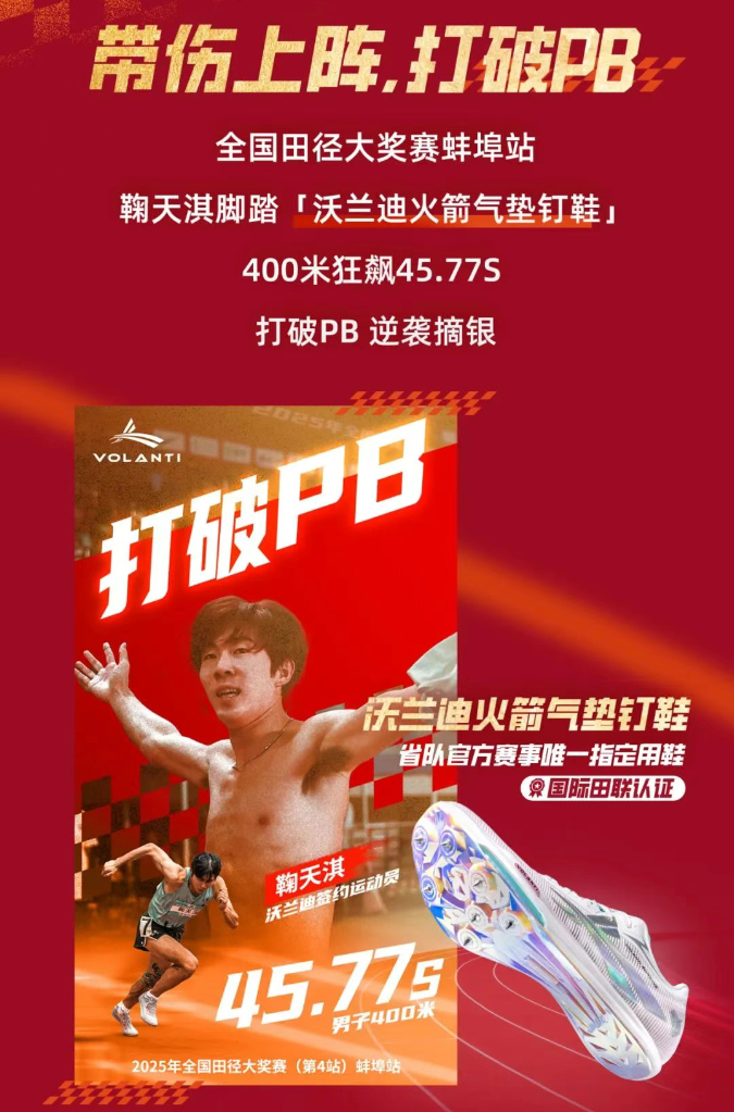 在竞争激烈的全国田径大奖赛赛道上,备受瞩目的新星鞠天淇脚蹬 沃兰迪“火箭”气垫钉鞋 ,如离弦之箭般疾驰。这双搭载前沿科技的钉鞋,为其提供了强大的推进力与精准的能量反馈。最终,鞠天淇以令人惊叹的表现,不仅刷新个人最佳成绩(PB),更在高手如云的赛场上强势夺魁。沃兰迪火箭气垫钉鞋,成为他突破极限、点燃赛道的核心引擎。