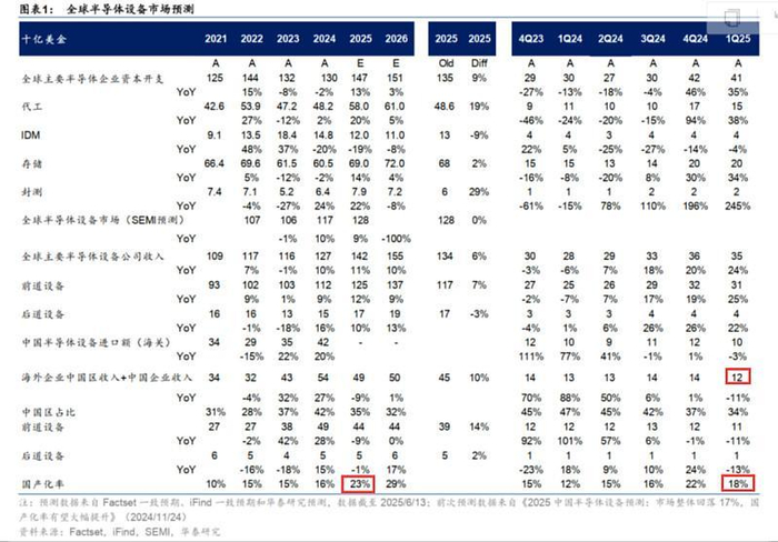据华泰证券统计,我国设备企业收入保持39%同比高速增长,国产化率达到18%,同比+6pct。往后看,据华泰预测及iFind一致预期,国内主要设备公司收入2025年同比或增长30%,国产化率或同比+7pct至23%。