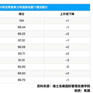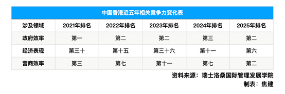 值得关注的细节,还包括今年《年报》中相关数据与此前的排名对比。例如,中国香港特区的政府效率上升一名至世界第二,经济表现排名则由世界第十一升至世界第六,教育亦由第四升至第二。