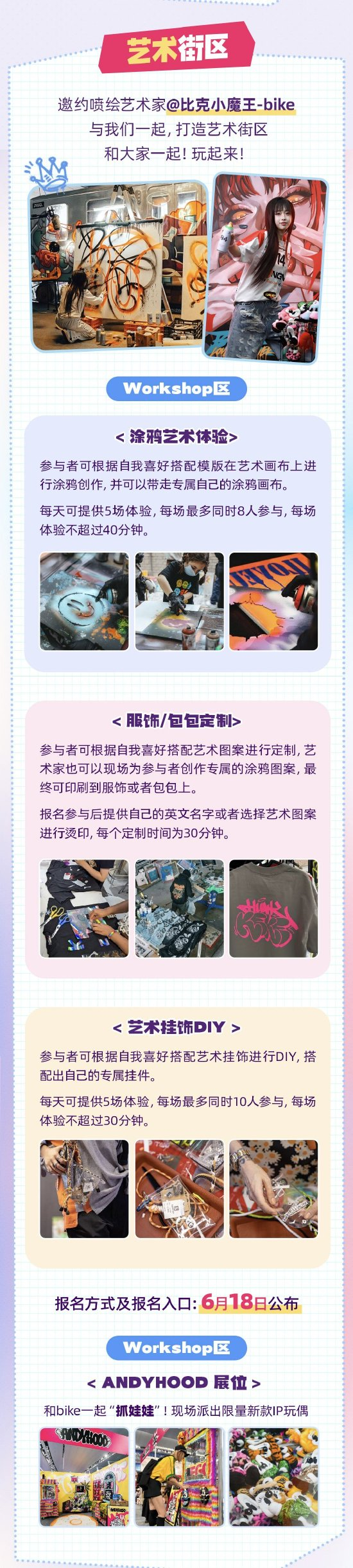 艺术街区特邀知名喷绘艺术家@比克小魔王-bike坐镇,设置互动工坊(Workshop),引导参与者亲身感受二次元文化中蓬勃的创作活力。活动包括: