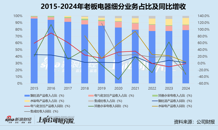 2024年,老板电器吸油烟机和燃气灶销售收入分别为54.55亿元、27.77亿元,两类核心产品支撑起总营收的73.4%;消毒柜、一体机、洗碗机、集成灶、热水器的收入之和约24.34亿元,不足吸油烟机单项收入的45%;蒸汽炉、电烤箱、净水器和小家电的收入都在千万元级别,合计占总营收比例不超过2%。