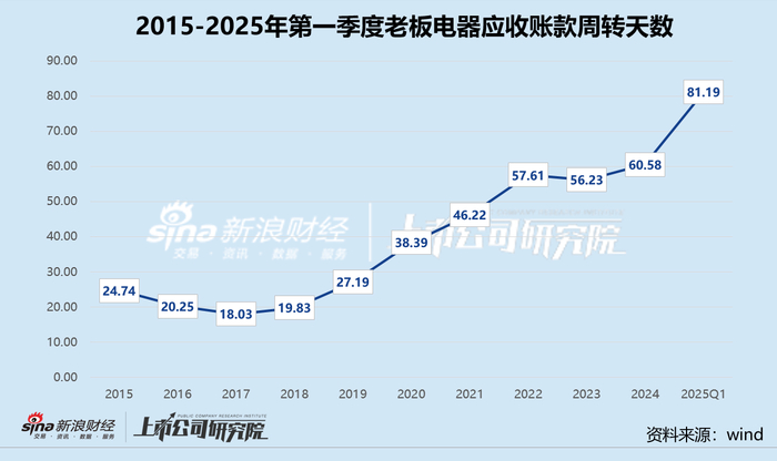 2021-2024年,公司应收账款账面价值分别为15.98亿元、16.90亿元、18.10亿元、19.64亿元,呈逐年递增趋势,因房地产公司客户债务违约计提坏账准备累计高达40.33亿元。2025年第一季度,老板电器应收账款达17.82亿元,甚至比2024年净利润还要多2.26亿元,约为当期净利润的5.3倍,深陷“纸面富贵”窘境。公司应收账款周转天数突破80天,与2024年末相比陡增34.0%。