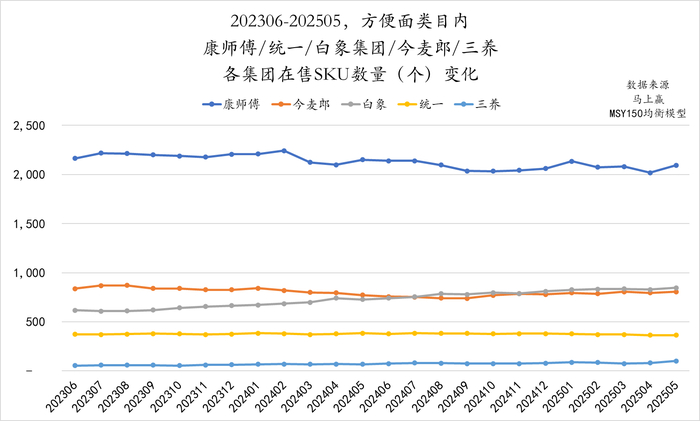 值得关注的是统一、白象与今麦郎三个集团的在售SKU数量的对比与变化趋势。可以看到,统一在市场份额和销售规模领先的背景下(2025Q1数据),其在售SKU数量是三家中最少的,这也意味着统一可以以相对简单的产品运营与管理体系,完成同样的销售规模,其效率更高。相比来说,今麦郎则是以统一将近一倍的SKU数量规模,实现小于统一的销售额与市场份额结果(2025Q1数据)。SKU数量规模过大对于管理能力、渠道运营能力都是很大的考验。