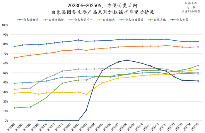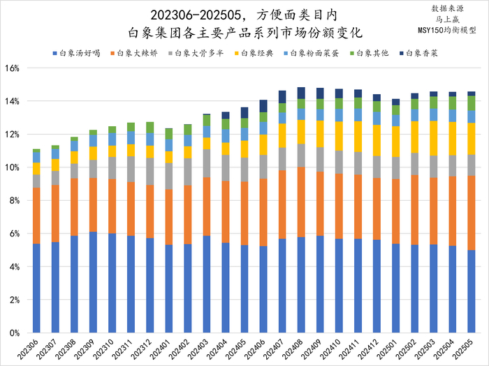 为了进一步观察白象集团正在发生的变化,我们选择了白象集团近两年(202306-202505)中,在方便面类目中市场份额较高的七个产品系列,按照期内整体的市场份额排序分别是白象汤好喝、白象大辣娇、白象大骨多半、白象经典、白象粉面菜蛋、白象其他、白象香菜。在白象集团中,上述七个系列在白象集团整体在方便面类目中的市场份额占比超过95%。