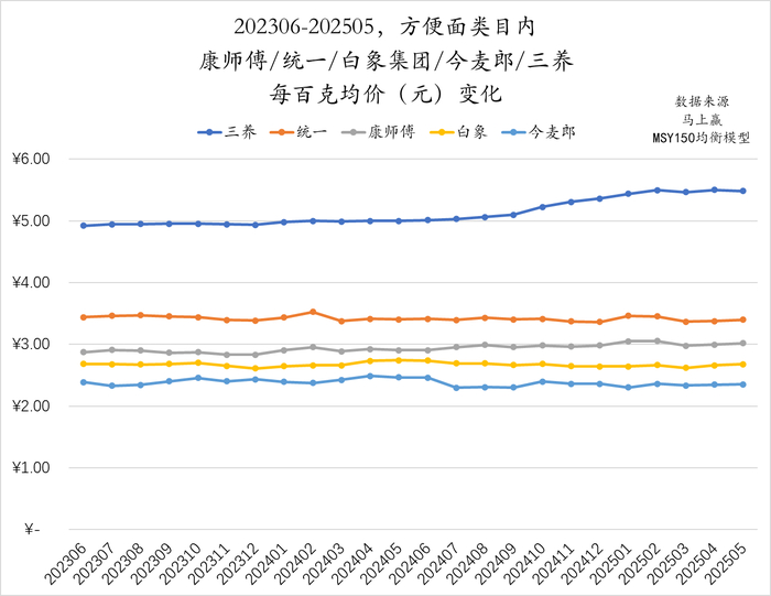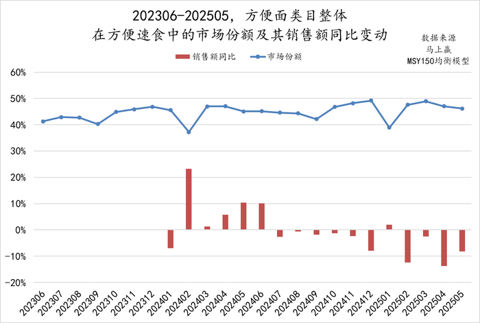 但另一方面,基于马上赢MSY150均衡模型中的销售额同比数据可以看到(数据自2024年1月开始),排除2024/2023、2025/2024两年中的春节错位因素外,2024年上半年同比2023年,方便面类目的销售额整体有一定的同比增长;在2024年的下半年,销售额同比情况有所下滑,处于正负波动当中;但到2025年上半年,排除了春节月的错位后,2025年4、5月,方便面类目依然出现了接近10%的销售额同比下滑。