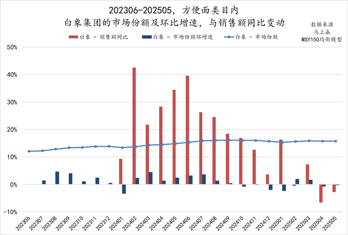 可以看到,从202306到202505的时间段中,白象集团在方便面类目中的市场份额一直处于上升通道中,从大约12%左右一路上升到15%~16%左右。从市场份额的环比增速来看,2024年上半年,白象集团的市场份额增长较为明显。2024年下半年,其市场份额增速放缓,偶尔出现微跌,但在2025年上半年,排除春节错位影响后,市场份额环比出现了小幅度的震荡。