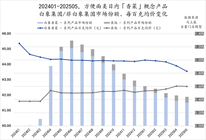 这种产品创新带来的领先优势,并不只在于市场份额的表现上,还在于产品价格与议价能力上。可以看到,自2024年4月,香菜面类型产品在市场中升温开始,白象作为引领者的每百克均价始终远高于其他后期进入的产品,今年3月以后虽然也存在一定的下行压力,但依然远高于白象以外其他品牌的香菜系列产品。相比来说,后进入香菜类型产品的SKU只能通过价格的方式突围,其每百克均价即便显著低于白象,市场份额依然在类型产品中占比很低。