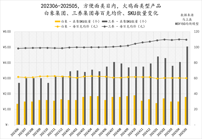 在202306-202505这一时间段中,可以看到,白象的在售SKU数量规模有着较为显著的上升,且已经在2025年超过了今麦郎。其一方面意味着白象在产品推新上有着很强的动力,但另一方面,与今麦郎的情况类似,白象集团也是通过高于统一集团近一倍的SKU数量,实现与统一的“无限接近”。SKU数量规模越大,对于产品管理、渠道运营等能力的要求就越高,且这种要求的提升通常不是线性相关提升而是指数级别的提升,如果管理能力、运营能力无法达到SKU规模的要求,则可能面临着更多的压货窜货、价盘管控失效、渠道效率降低等问题,从而对于整体的销售带来相当大的、长期性的负面影响。