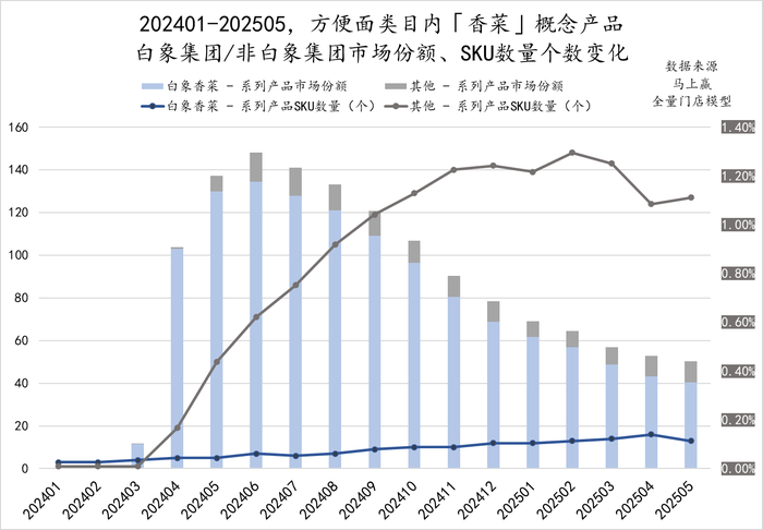 可以看到,由白象集团引领并率先推向市场的“香菜”系列方便面产品,从2024年3月开始推广以来,白象的香菜系列产品SKU数量始终不多,但其在类型产品的市场份额中却始终占据着相当高的比重。相比来说,虽然香菜类型产品在2024年4月爆火以后,有更多的品牌、产品加入希望分一杯羹,其SKU数量规模也数倍于白象,但始终在香菜这一类型产品的市场份额上与白象差距显著。