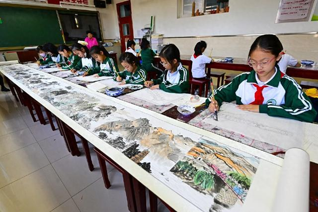 社团美术老师郭竹君介绍,美术社团自成立以来,每学期都会有不同的创作主题。“比如我们之前画过大运河沿岸的胡同,通州的十八个半截胡同之前是码头边的牛马市,创作过程中孩子们也了解了运河文化。这学期我们以北运河、运潮减河、温榆河上的11座船闸为主题,如果直接让他们画,孩子们不明白什么意思,所以第一节课我先给他们介绍船闸,并用图片参考,让他们自己构思。”郭竹君展开一幅国画长卷,是由孩子的画作拼接而成,水波荡漾,古塔凌云,浓淡墨迹间尽是运河风情。“这幅画叫《运河胜景图》,世界水日时我们还把它拿到北运河管理处在大光楼举办的主题活动中展示,大家的反响特别好。我们希望努力做到‘一学期一长卷’,展示孩子们眼中的运河胜景。”郭竹君说。