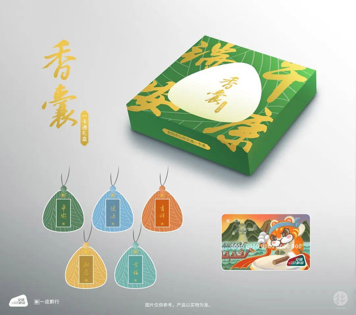 端午主题纪念卡将虎这一形象卡通拟人化,以赛龙舟的节日场景为衬托,并将贵阳的标志性建筑——贵阳孔学堂融入背景中,彰显贵阳的地域特色。每份包含贵阳市公共交通一卡通壬寅年端午主题纪念卡一张,以及一个粽子形状的香囊,一并装入以粽叶绿作为主题色的精美礼盒中。