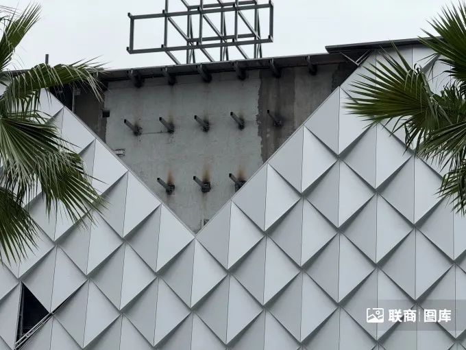 实探当天是6月5日,可以看到整个建筑主体早已完工,外立面整体以深色的墙砖为主,门店的主入口外立面幕墙,则采用片状的铝板设计,已经基本铺设完成。