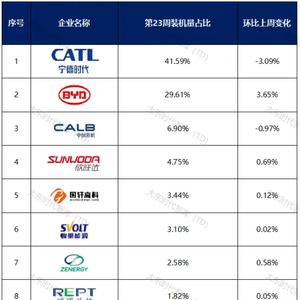 相较于第22周,本周前十榜单排位变化不大,亿纬锂能排名下降两位,位居第九,占比1.72%。