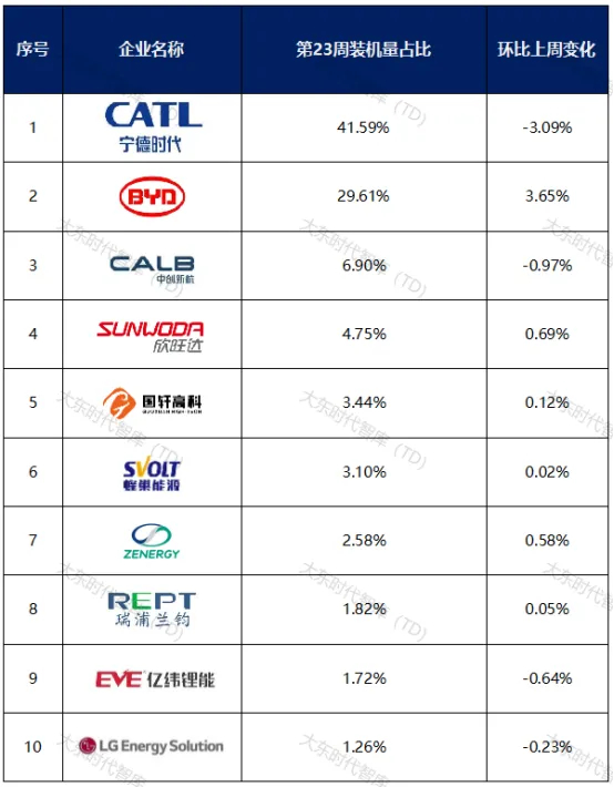 2025年第23周(6月2日-6月8日),中国新能源乘用车动力电池装车量TOP10企业分别是宁德时代、比亚迪、中创新航、欣旺达、国轩高科、蜂巢能源、正力新能、瑞浦兰钧、亿纬锂能、LG新能源。