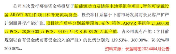 2024年4月,长盈精密又斥资28.63亿元建设生产基地,其中18.28亿元用于在常州、宜宾两地建设新能源动力及储能电池零组件项目,预计2027年投产。项目达产后,公司将新增2.16亿件顶盖、2.88亿件壳体和34万件箱体的产能。