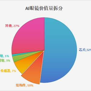 在AI眼镜中,芯片凭借52%的价值量占比拔得头筹,结构件紧随其后,占比达10%,超过了传感器(7%)、声学模组(3%)等零部件。
