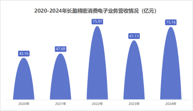从业绩表现看,2020到2024年长盈精密消费电子业务营收从43.16亿元增长到75.16亿元,年复合增长率为11.73%。