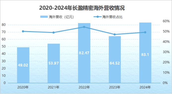 2020到2024年,公司海外营收从49.02亿元迅猛增长至83.1亿元,海外营收占比始终保持在50%左右,与国内业务平分秋色。