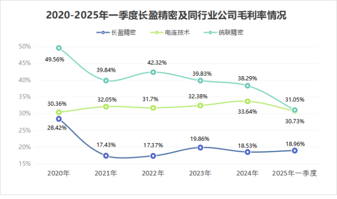 2020到2024年,长盈精密毛利率从28.42%下降至18.53%,下降了约10个百分点。横向对比来看,公司2024年的毛利率水平,远低于电连技术(33.64%)、统联精密(38.29%)等消费电子企业。