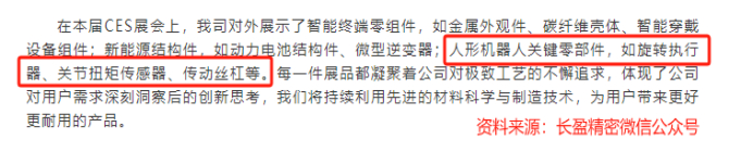 2024年6月,长盈精密成立深圳市长盈机器人有限公司,专注于从事人形机器人业务,产品包括关节齿轮、轴承、指尖传感等。在2025年CES展会上,公司展出了旋转执行器、关节扭矩传感器、传动丝杠等人形机器人零部件。