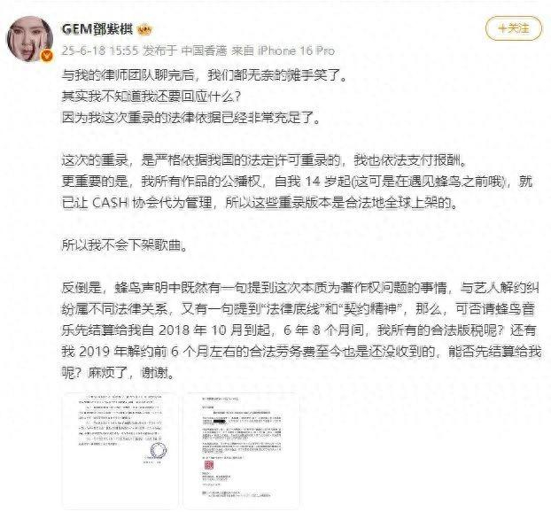 反倒是,蜂鸟声明中既然有一句提到这次本质为著作权问题的事情,与艺人解约纠纷属不同法律关系,又有一句提到“法律底线”和“契约精神”,那么,可否请蜂鸟音乐先结算给我自 2018 年 10 月到起,6 年 8 个月间,我所有的合法版税呢?还有我 2019 年解约前 6 个月左右的合法劳务费至今也是还没收到的,能否先结算给我呢?麻烦了,谢谢。