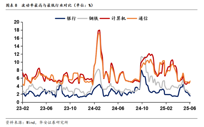 同时小盘、中盘、大盘股的波动率分布类似,但波动率大小呈现显著分化,小盘股波动率显著高于大盘股。大盘股整体波动率最低,中盘股其次,小盘股整体波动率最高。此外,不同行业的波动率和行情表现呈现显著分化,高波动率行业与低波动率行业之间差异显著,以稳健性为代表的银行行业与高风险的计算机行业波动率差异高达4.6%。