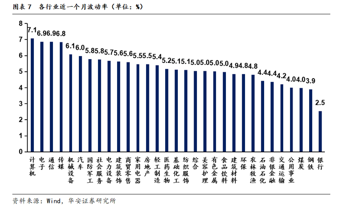 市场整体处于震荡行情中,波动率小幅下滑,各行业表现也是如此。不同行业的波动率和行情表现呈现显著分化,高波动率行业与低波动率行业之间差异显著。计算机行业作为所有行业之首,波动率最高,同时电子、传媒、通信、国防军工等行业波动率也较高,位于行业波动率上游水平。而银行作为稳定性的代表,波动率显著低于行业整体水平,为全行业最低;同时钢铁、煤炭、公共事业等行业波动率也处于行业下游水平。波动率最高的计算机行业与波动率最低的银行行业近一个月波动率相差4.6%。
