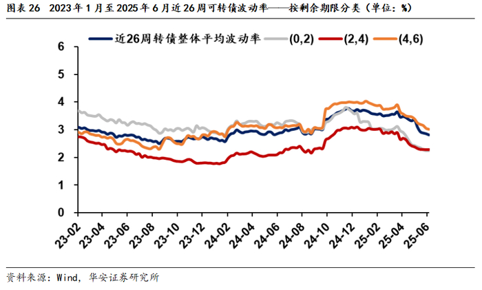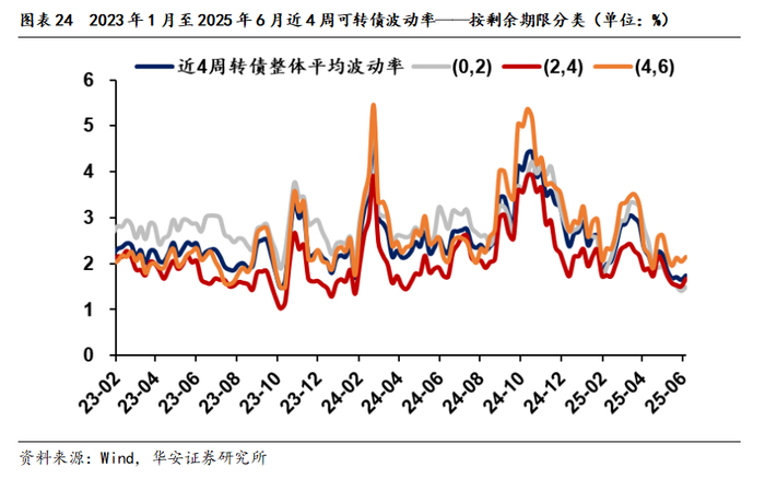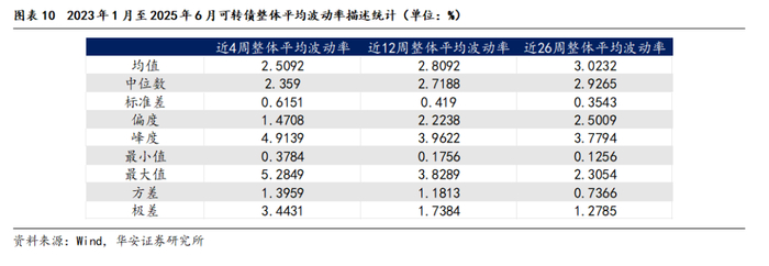 从整体来看,2023年1月至2025年6月近4周可转债整体平均波动率(短期)振幅明显大于近12周(中期)与近26周(长期)可转债整体平均波动率,且周期性较为明显。截至2025年6月6日,近4周可转债整体平均波动率为1.74%,近12周可转债整体平均波动率为2.30%,近26周可转债整体平均波动率为2.82%,2025年以来,除2025年2月28日至2025年3月28日期间内近4周可转债整体平均波动率短暂高于近12周可转债整体平均波动率,其余时间段三者波动率水平均为近26周(长期)>近12周(中期)>近4周(短期)。如图表9所示,三条曲线分别对应近4周(短期)、近12周(中期)、近26周(长期)的滚动平均波动率,本质是对可转债市场波动的“多时间窗口观测”。近4周可转债平均波动率聚焦短期高频交易冲击,其波动率序列的标准差、极差与峰度,均明显高于中长周期曲线,且短期波动率曲线的周期性特征更为明显,具体表现为在2023Q4(2023年10月27日近4周整体平均波动率达到3.36%)与2024Q4(2024年10月11日近4周整体平均波动率达到4.40%)、2024Q1(2024年2月23日近4周整体平均波动率达到4.91%)与2025Q1(2025年3月14日近4周整体平均波动率达到3.04%)达到阶段性峰值,具体原因可能包括以下几点:第一,年报预期分化:市场对上市公司全年业绩预期分化加剧,引发正股及关联转债价格剧烈波动;第二,条款预期驱动:包括回售预期、下修预期、强赎预期等;第三,政策预期变动:年底重要经济政策会议预期及市场情绪波动放大整体风险偏好变化;近12周可转债平均波动率刻画中期趋势性预期分化,近26周可转债平均波动率锚定长期系统性风险中枢,样本期间二者整体波动幅度较为一致,反映出市场处于平稳波动周期。