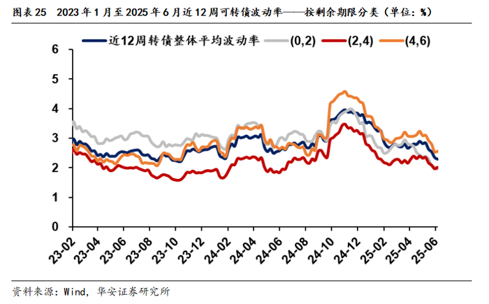 从整体来看,2023年1月至2025年6月近4周可转债整体平均波动率(短期)振幅明显大于近12周(中期)与近26周(长期)可转债整体平均波动率,且周期性较为明显。截至2025年6月6日,近4周可转债整体平均波动率为1.74%,近12周可转债整体平均波动率为2.30%,近26周可转债整体平均波动率为2.82%,2025年以来,除2025年2月28日至2025年3月28日期间内近4周可转债整体平均波动率短暂高于近12周可转债整体平均波动率,其余时间段三者波动率水平均为近26周(长期)>近12周(中期)>近4周(短期)。