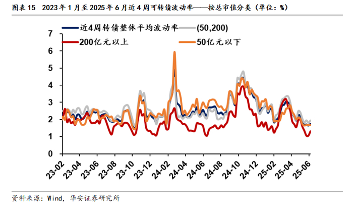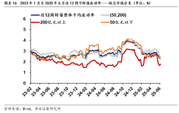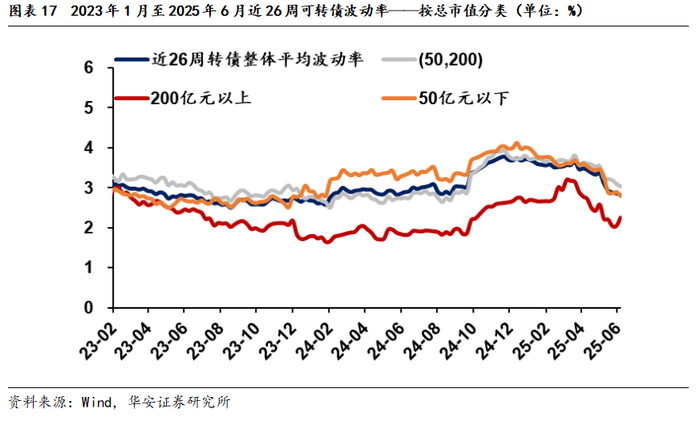 近4周、12周及26周按总市值分类的可转债平均波动率均显示,200亿元以上市值的可转债波动率水平较低,走势平稳。主要原因是大市值转债的发行企业通常规模庞大、财务状况稳健、抗风险能力强,受市场波动影响较小。而50亿元以下市值的可转债波动率较高,波动频繁。在市场环境变化较大时,小市值企业经营稳定性相对较弱,受宏观经济、行业竞争等因素冲击更为明显,导致其波动率变动加剧。在(50,200)亿元市值区间的可转债,波动率介于两者之间,呈现出过渡特征。长期来看,不同市值区间可转债波动率差异相对稳定,但在市场周期转换、行业轮动等特殊阶段,这种差异可能扩大或缩小。风险偏好低的投资者可侧重于大市值可转债,获取稳定票息收益;风险偏好高的投资者可关注小市值可转债,追求高弹性收益,但需承担更高风险。