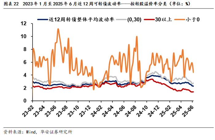 根据转股溢价率水平对转债短中长期波动率进行分类,负溢价率的可转债波动率在样本区间内呈现大幅震荡的走势;转股溢价率在(0,30%)的可转债与转股溢价率在30%以上的可转债波动率较为平稳,且走势较为一致。负溢价率的可转债波动率在样本区间内呈现大幅震荡的走势,主要原因有几点:第一,负溢价率意味着可转债股性较强,转债价格紧贴正股,当正股波动时,转债因内嵌杠杆属性波动被放大;第二,套利资金高频交易;第三,负溢价率多出现在临强赎期,受强赎条款驱动。转股溢价率在(0,30%)的可转债与转股溢价率在30%以上的可转债波动率较为平稳,且走势较为一致,原因在于这两类可转债股性与债性呈平衡态势(转股溢价率在30%以上的转债债性更强),条款驱动呈平滑波动以及配置型资金占主导。在市场行情变化时,不同转股溢价率区间可转债表现出不同波动率特征。行情上涨阶段,转股溢价率低的可转债能更好地跟随正股上涨,涨幅大,波动率增加;行情下跌阶段,转股溢价率高的可转债因债性保护,跌幅小,波动率稳定。市场上涨预期强时,投资者可适当选择低转股溢价率可转债获取高收益;市场下跌风险大时,高转股溢价率可转债可提供风险缓冲,优化投资组合的风险收益结构。