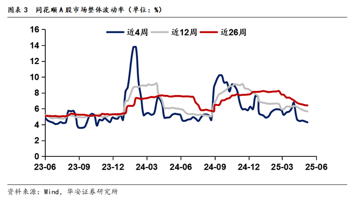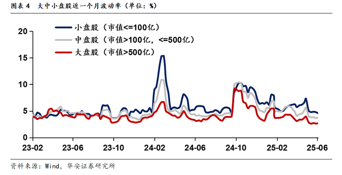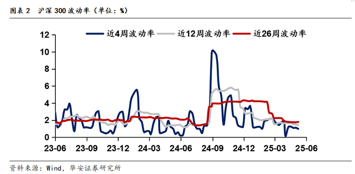 权益市场方面,本文以2023年1月1日-2025年6月6日为样本区间,通过计算近4周(短期)、近 12周(中期)、近26周(长期)的滚动平均波动率,观测多个不同周期的波动率。选择上证50、沪深300两个具有权益市场代表性的指数,将全部A股分类为大中小盘与不同行业,观察不同盘面与不同行业股票的波动率分布。