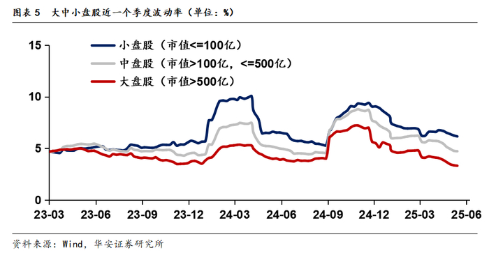 从A股市场不同市值板块的波动率表现来看,小盘、中盘、大盘股的波动率分布类似,但波动率大小呈现显著分化,大盘股整体波动率最低,中盘股其次,小盘股整体波动率最高。例如,近一个月大盘股平均波动率为3.06%,中盘股平均波动率为4.1%,小盘股则5.01%。近一个季度大盘股平均波动率为3.92%,中盘股平均波动率为5.4%,小盘股则6.46%。近半年大盘股平均波动率为5.51%,中盘股平均波动率为6.96%,小盘股则7.95%。而拉长时间来看,近一个季度与近半年大中小盘股同样呈类似分布。