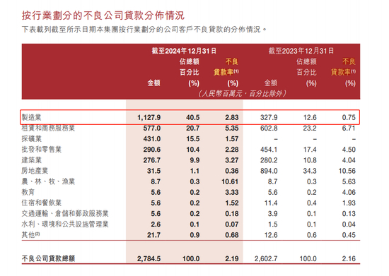 其中,制造业的不良贷款余额从2023年底的3.28亿元增加至2024年底的11.28亿元,同比激增244%,占该行公司不良贷款总额的40.5%,行业的不良率也从2023年底的0.75%升至2024年底的2.83%,骤升2.08个百分点;同时,采矿业不良贷款更从零攀升至4.31亿元,占该行不良公司贷款总额的15.5%。