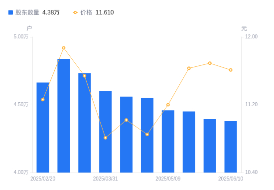 近一年(2024年6月20日至2025年6月10日),新疆交建A股股东户数从5.01万户,减低至4.38万户,降幅12.56%,区间股价上涨13.88%。