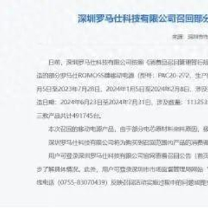 据深圳市市场监督管理局官网6月16日发布的公告,因部分产品在极端场景下可能存在燃烧风险,深圳罗马仕科技有限公司将召回2023年6月5日—2024年7月31日制造的部分移动电源,涉及PAC20-272、PAC20-392、PLT20A-152三款型号,共计491745台。