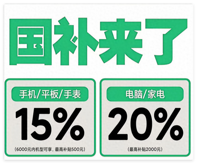 - **数码产品**:手机/平板/智能手表按售价15%补贴,最高500元