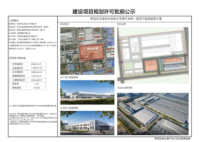 6月11日,青岛轨道交通产业示范区官微发布《关于青岛比亚迪纯电动客车零部件处理一期项目规划建筑方案规划许可批前公示》。