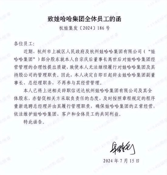 “部分股东就本人自宗庆后董事长离世后对娃哈哈集团经营管理的合理性提出质疑,致使本人无法继续履行管理职责。”