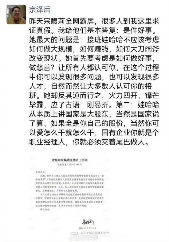 宗庆后的弟弟宗泽后也不为大侄女说话,甚至还颇有些落井下石的意思。